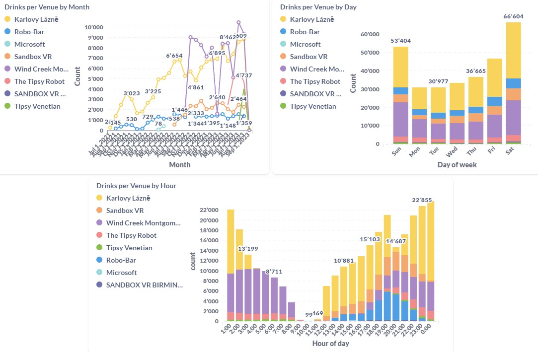 Makr Shakr is an around the clock solution that offers quality drinks and top performance, opening up avenues to grow your business. By providing extensive analytics from your customers, Makr Shakr helps businesses make more informed decisions moving forward. Some analytics include drink per venue (day, month, & year), income by venue, drinks ordered (day, month, & year), alcoholic vs. non-alcoholic drinks, top-selling brand spirits, and much more!
