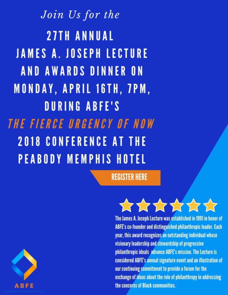 Join Us on Mon., April 16th, at the Peabody Memphis, for the 27th Annual James A. Joseph Lecture and Awards Programs | Visit ABFE-CONFERENCE.ORG For More Info