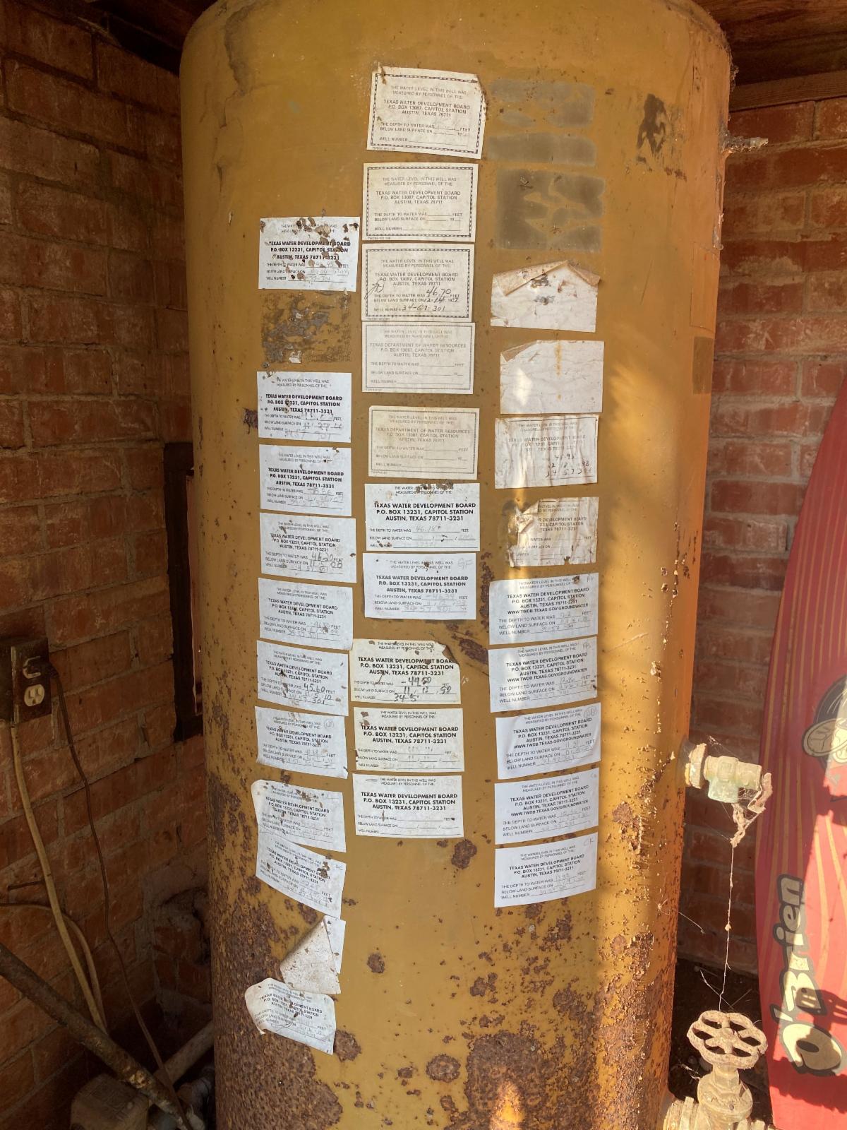Henderson County well house with stickers indicating water level measurements taken by TWDB staff since 1976.