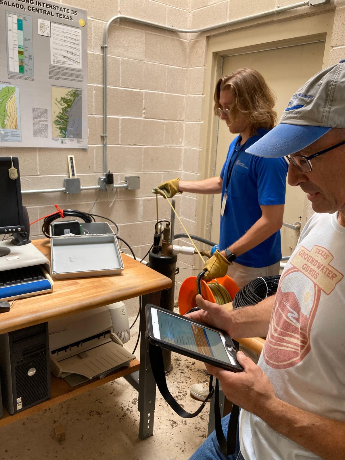 Colt Kernan and Andrew Weinberg demonstrating water level measurement techniques at a Texas Alliance of Groundwater Districts Business Meeting.