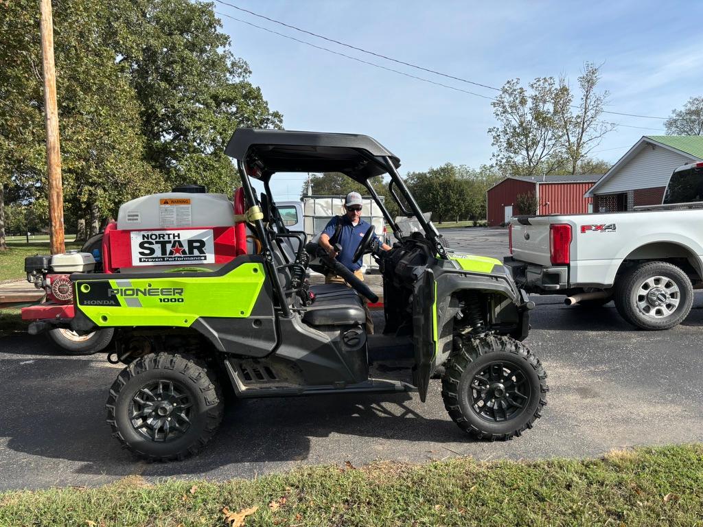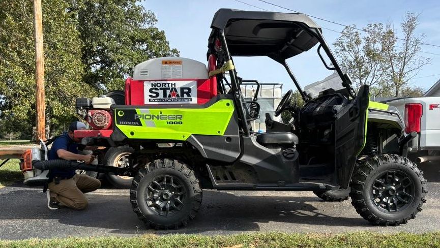 Pictured above is Missouri Prairie Foundation Director of Prairie Management Jerod Huebner using a leaf blower to blow off the interior and exterior of a UTV before driving it to a new location for habitat stewardship work. This simple action takes only a few minutes, yet helps prevent any seeds of invasive plants that might be "hitchhiking" on equipment from spreading to new locations.