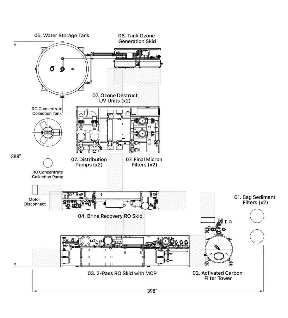 It was designed as an integrated water purification system for a beverage bottling application. The system includes all major components including the following: