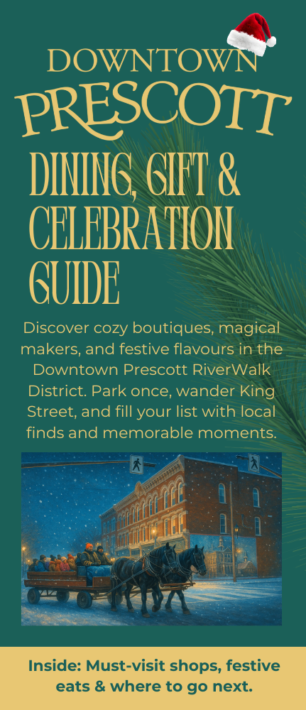 The Downtown Prescott Dining, Gift & Celebration Guide is now available—your go-to resource for discovering the best of the holiday season in our historic downtown. The guide showcases local shops, festive flavours, unique gifts, and inviting places to gather, all within steps of one another along King Street. Whether you’re checking off your list, planning a holiday meal, or looking for ways to celebrate with friends and family, the guide makes it easy to explore everything Downtown Prescott has to offer.