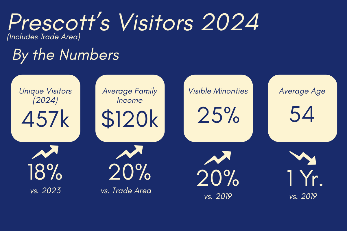 Prescott welcomed over 457,000 unique visitors in 2024—an 18% year-over-year increase—with 74% originating from South Grenville and Brockville, the town’s primary trade areas, and 26% from other locations. Visitors often explore multiple business districts during their stay, and the average visiting household earns about $120,000, spending actively in dining, recreation, and shopping.