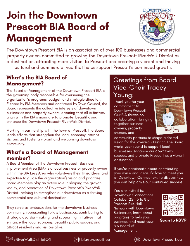 The Downtown Prescott Business Improvement Area (BIA) is now accepting nominations for its Board of Management. The Board oversees strategic initiatives to energize Prescott’s RiverWalk District.