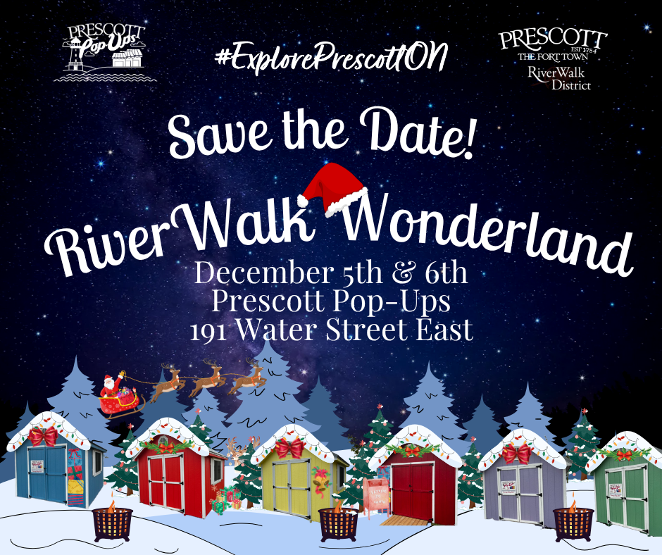 Join us in bringing the magic of the holidays to the waterfront! RiverWalk Wonderland transforms the Prescott Pop-Ups into a sparkling waterfront destination featuring lights, live entertainment, horse-drawn wagon rides, Santa & reindeer, markets, and festive activities that draw visitors from across Eastern Ontario.