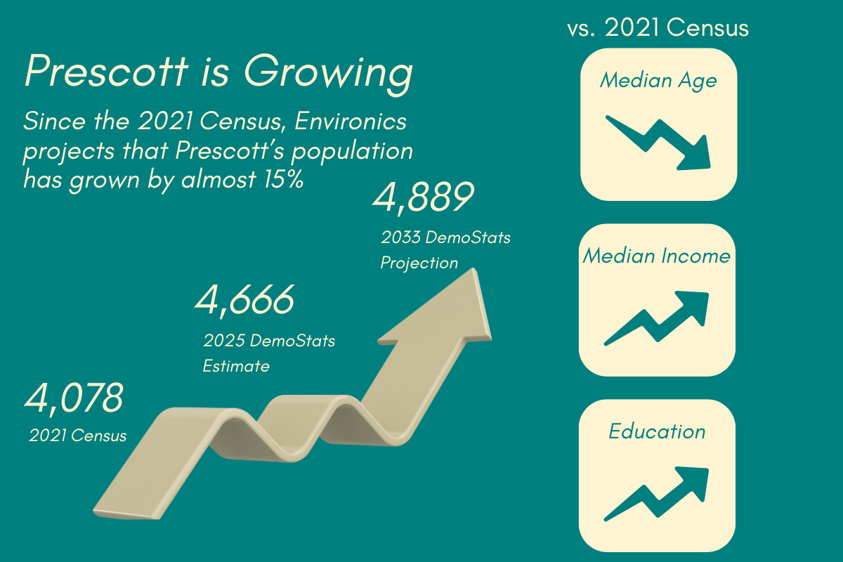 Prescott’s growth story continues to accelerate. According to Environics Analytics, the town’s population has increased by nearly 15% since 2021, reaching an estimated 4,666 residents in 2025 and projected to approach 4,900 by 2033.