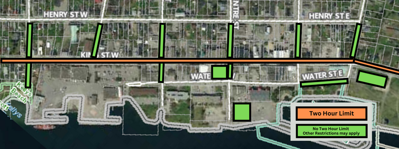 King Street has a two-hour parking limit, enforced Monday–Saturday, 9 AM–6 PM. For longer visits or shifts, please use municipal lots or side street parking.