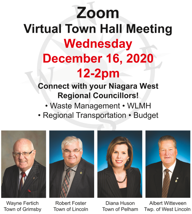 Join us on Wednesday, December 16 from 12 - 2 PM to connect with your Regional Councillors Wayne Feritch, Robert Foster, Diane Huson, and Albert Witteveen as they touch on what the Region's activities over the past year.
