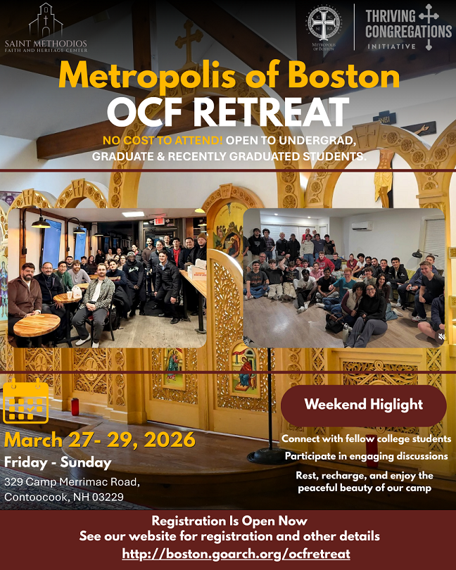 Join us March 27–29, 2026 at the Saint Methodios Faith & Heritage Center in Contoocook, NH for the Metropolis of Boston OCF Retreat. Open to undergraduate, graduate, and recently graduated students, this no-cost weekend invites you to step away from the noise of daily life and enter into meaningful fellowship, engaging discussions, and spiritual renewal. Surrounded by the peaceful beauty of camp, participants will connect with fellow college students from across the Metropolis, reflect on their faith, and build lasting friendships in a welcoming and supportive environment.