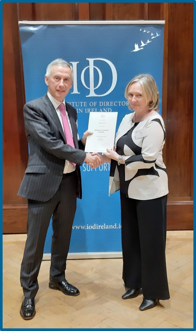Pictured in the photo, above: Margot Lyons CDir received her Diploma in Company Direction in September from IoD Ireland President, Harry Lorton. She has now qualified as a Chartered Director.
