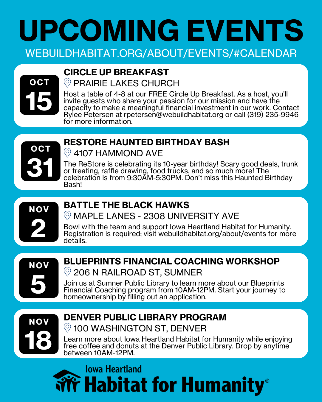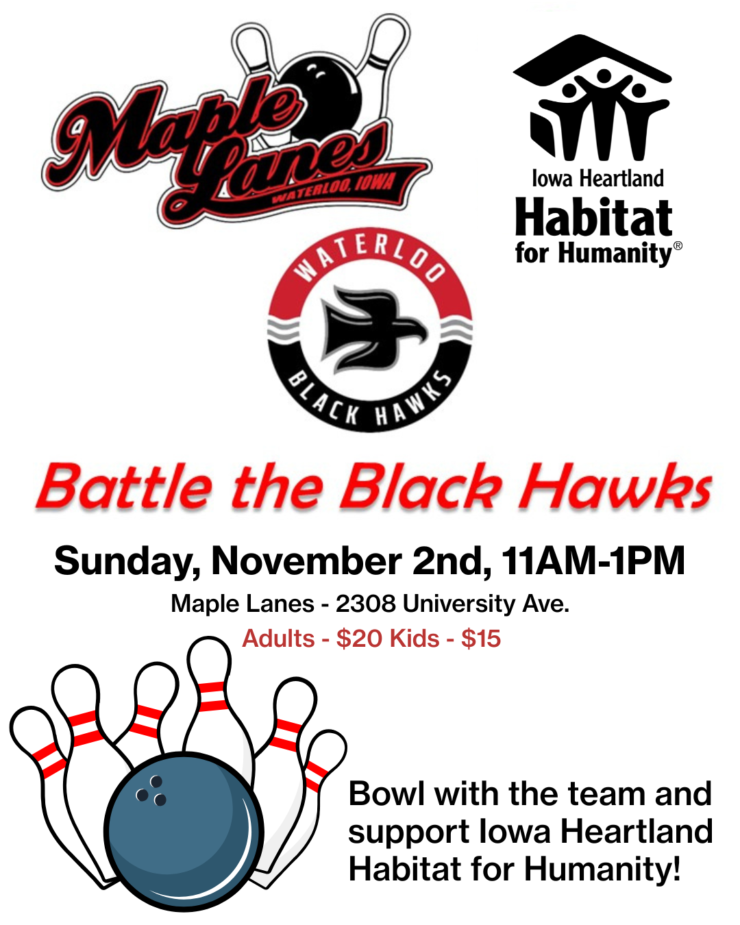 Join us Sunday, November 2nd, from 11 AM–1 PM at Maple Lanes for bowling and community fun with the Waterloo Black Hawks—all in support of Iowa Heartland Habitat for Humanity!