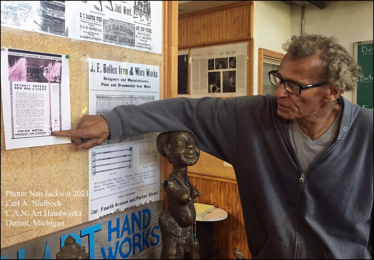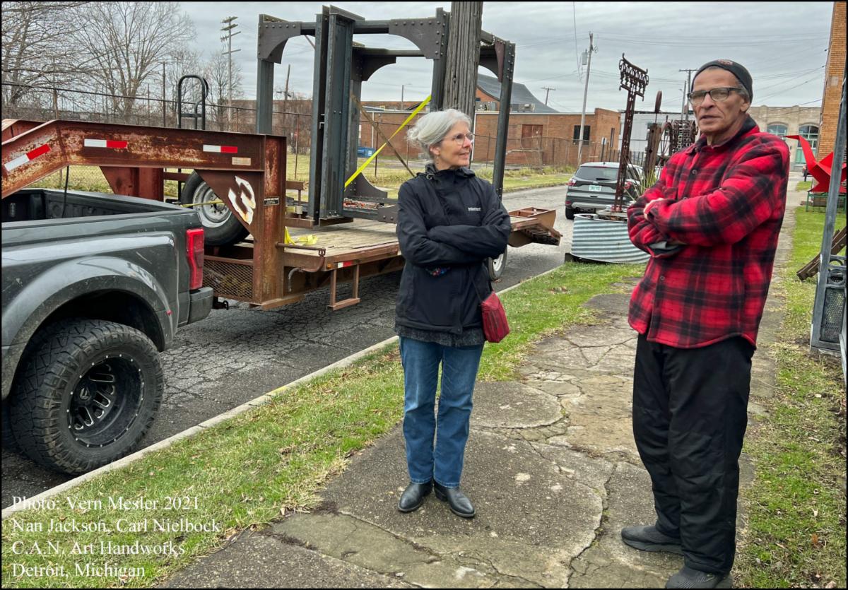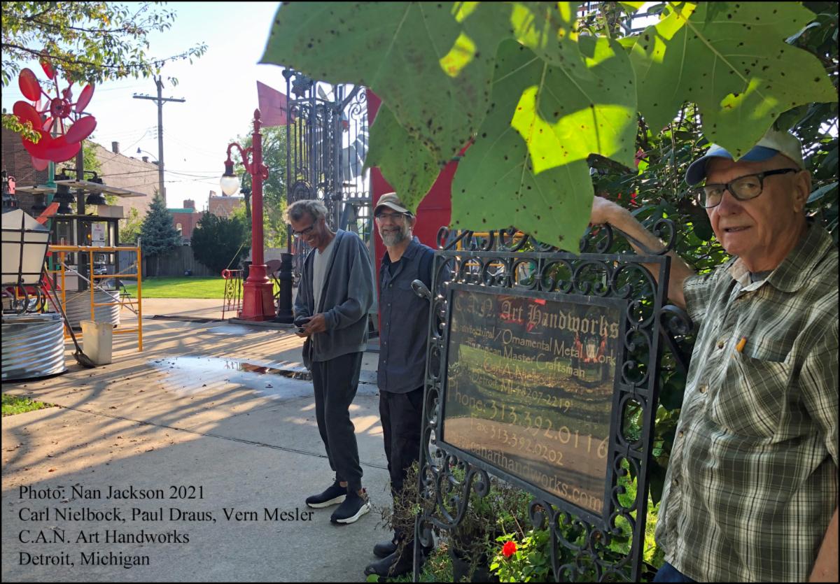 It began with my introduction to an artist craftsman and his art-filled Detroit compound. We were led through spaces filled with new and old art, and old relics from Detroit’s historic past. Stored on wood pallets were sections of a historic riveted truss bridge, rusted, bent, pieces of a once-stately structure that had spanned the Rouge River. This craftsman’s idea was to create a large arched gateway using sections of the bridge along with new riveted sections to display at some prominent location in Detroit.