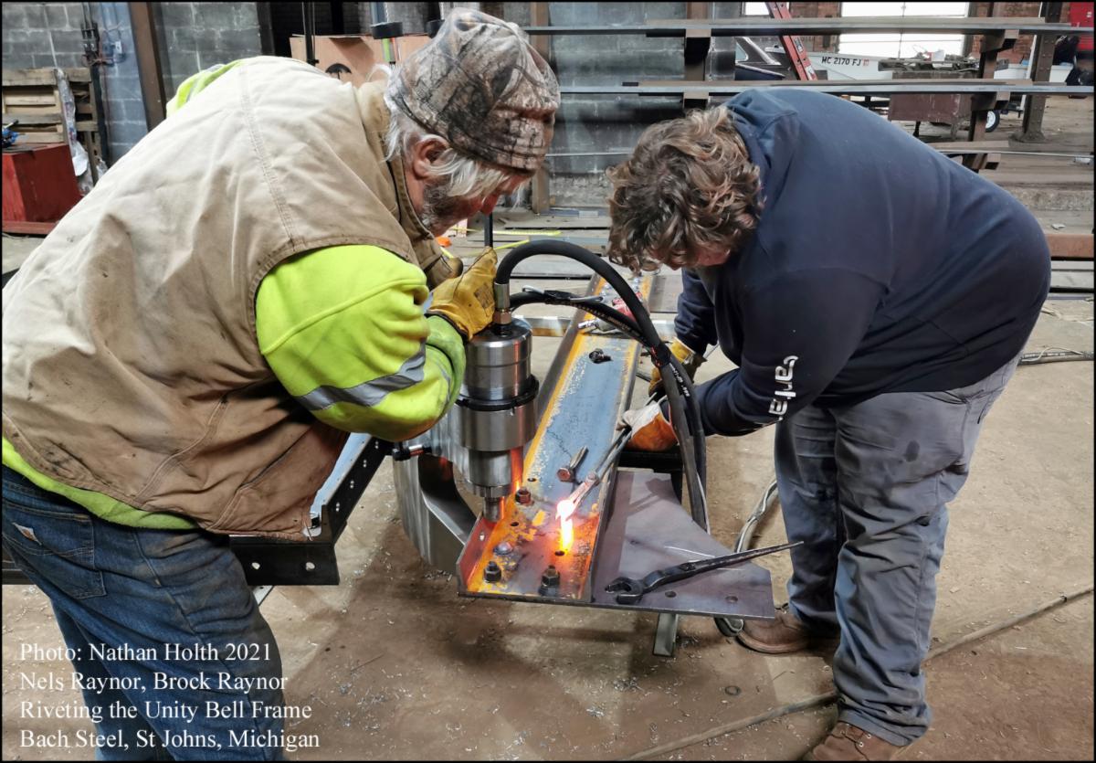 By mid-November, Raynor had the Unity Bell frame material prepped and ready for assembly; fabrication and riveting of the frame began. First, Raynor and his son Brock Raynor bolted and riveted sub-assemblies with 3/4” rivets driven with Bach Steel’s new hydraulic riveter. As the work progressed, Raynor involved more of his fabrication crew to finish riveting the Unity Bell frame and prepare it for shipping to Detroit.