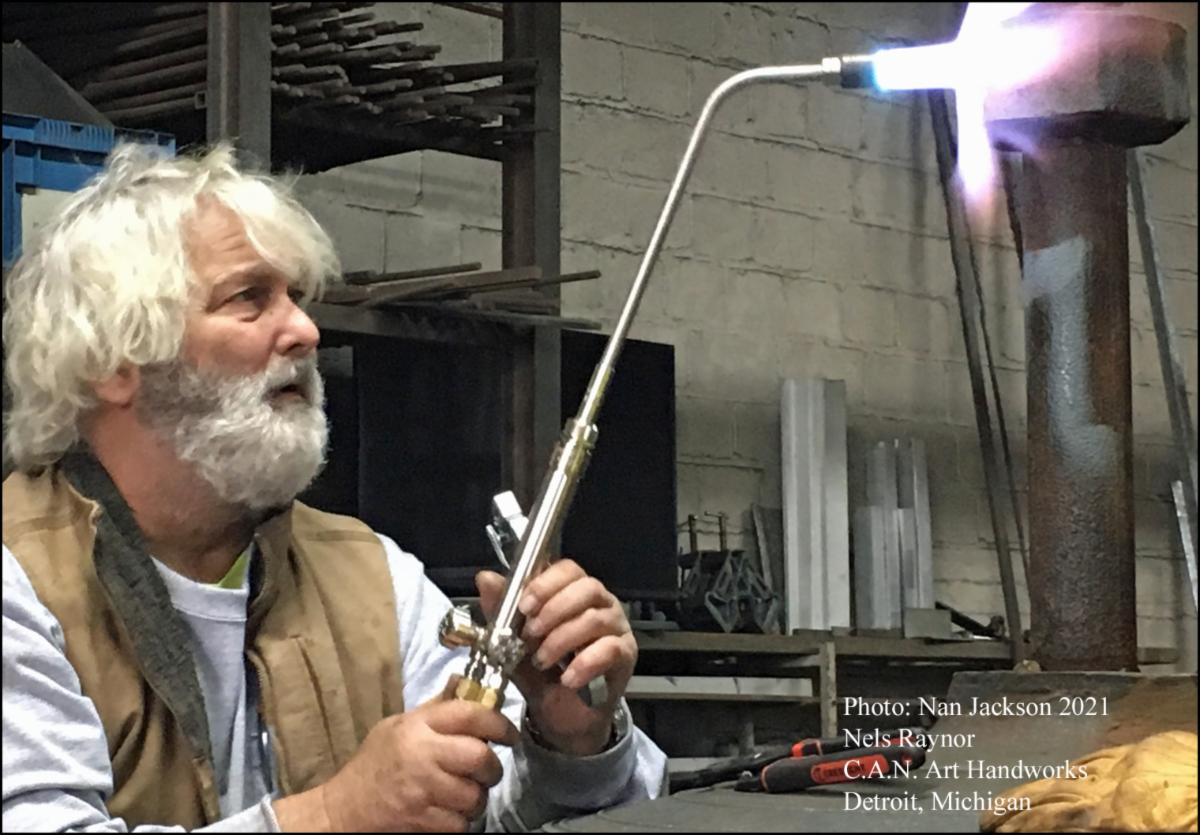 With support and encouragement from the Lansing Community College welding staff (a group of industrial craftsmen dedicated to the preservation of the industrial riveting process), a craftsman with years of experience preserving historic riveted truss bridges was asked to consider fabricating the bell frame. Nels Raynor, whose rough-edged shopman persona belies an artist, is someone who can operate a large industrial forklift and the tools of a steel fabricator with the same sensitive touch as any notable American sculptor.