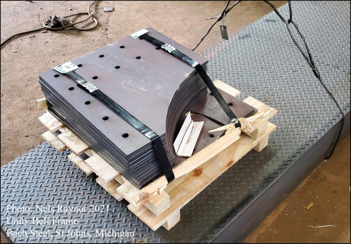 With Raynor’s approval, his Office Manager Nathan Holth and his Chief Estimator and Accountant Heather Raynor began purchasing the material for the fabrication for the Unity Bell’s riveted frame. On November 12, 2021, stacks of steel plate, precision cut with ALRO Steel’s plasma cutting systems, were ready for delivery to Raynor’s shop, Bach Steel in St. Johns, Michigan. Converting Sketchup prints to ALRO's plasma cutting systems produced plates with accurate shapes and holes ready for riveting.