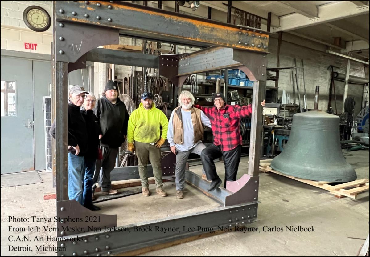 On December 15, 2021, Raynor, along with his son Brock and employee Lee Pung, arrived at Nielbock’s shop with the riveted frame loaded on a flatbed trailer. With a rented boom forklift, Raynor and his crew moved the Unity Bell from Nielbock’s yard into his shop, then unloaded the frame from the trailer to place beside the bell. Nielbock would continue the work by creating lettering and other finishing touches to make the frame and bell ready for display.