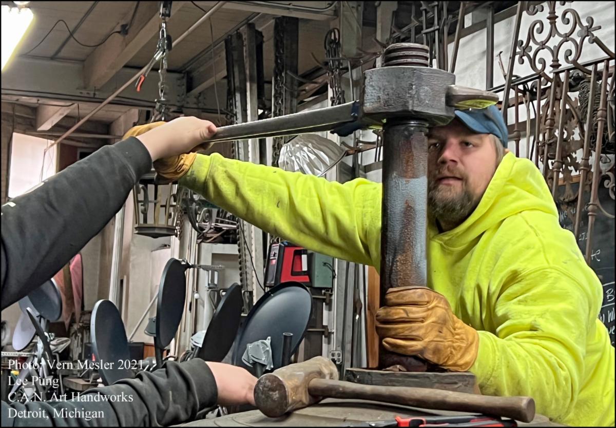 To prepare for this greater event, we were led to another historic piece that populated his collection of Detroit artifacts: a large bronze bell. Weighing nearly three tons, the late nineteenth century bell was a sound Detroiters heard from the Old City Hall until the building was demolished in 1961 and the bell lay abandoned. Rescued by Carlos Nielbock of C.A.N. Art Handworks, the artist craftsman whose shop we’d been touring, the bell now hung in a frame fabricated with found steel members and held in place with a large nut, frozen in place. Nielbock’s vision for this Detroit artifact was that it ring at the historic Eastern Market, displayed in a riveted frame.