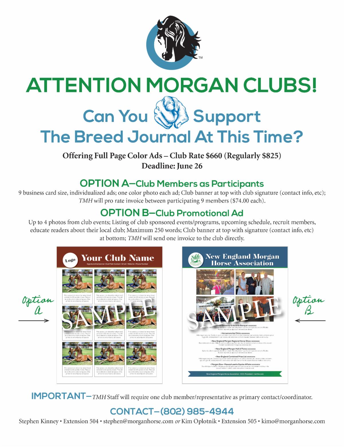 to remain financially viable at this time. Can your Morgan club participate in one of our special advertising options? We have two options to choose from for the club, full page color rate of $660. The graphic attached details the two designs and other specific information.