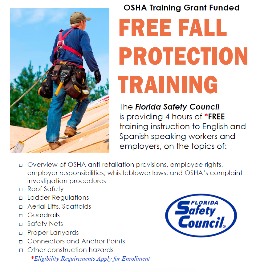 The Florida Safety Council's Free Fall Protection & Prevention Training is a 4.5-hour course targeted to an audience of small construction companies, sub-contractors and workers who work in high-risk, high-hazard, high-fatality positions. Training topics include roof safety, ladder regulations, aerial lifts, scaffolds, guardrails, safety nets, proper lanyards, connectors and anchor points, and other construction hazards. Training will initially be conducted in English.