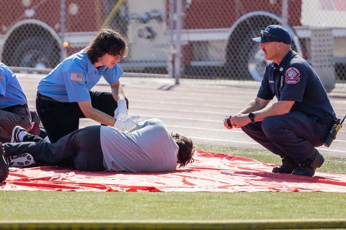 The simulation began with a staged explosion of a golf cart on the field. Theater students acted as victims, while CTE students responded as emergency personnel. Using the knowledge and training they had gained throughout the year, students assessed the victims, triaged them with color-coded tags, and provided initial treatment—all while adapting to changes in real time. With professional firefighters and EMTs by their side, students explained the decisions they were making during the triage process, including why they assigned specific colors and how those choices affected outcomes. This interactive process allowed for critical thinking and practical application under pressure. For CTE students, this was a crucial opportunity to apply their skills in a realistic scenario that mirrored the challenges they may face in the field.