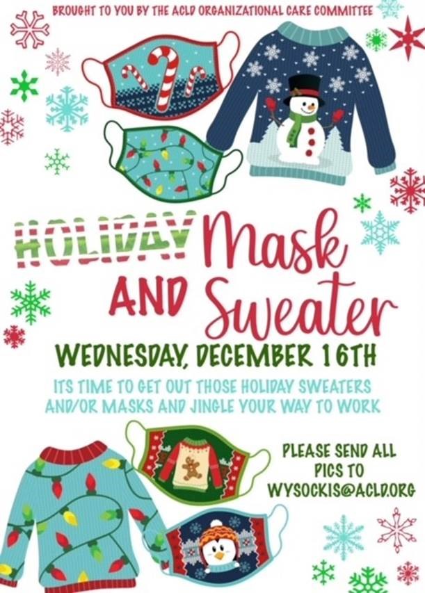 Make sure you wear your Holiday Mask or Sweater and send pictures of you and your team to wysockis@acld.org.