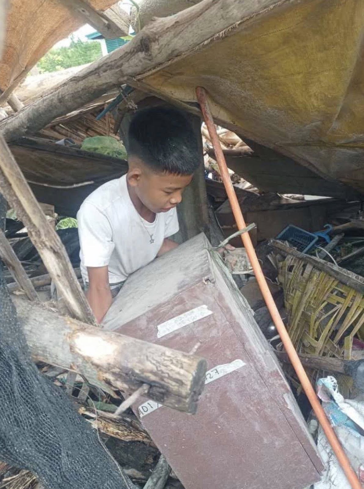 Pictured here is a photo from Ophelia “Pangging” Inot, our active seed saver in Tabogon, Cebu (north) sharing their totally damaged house, but still managed to secure their seed library box!