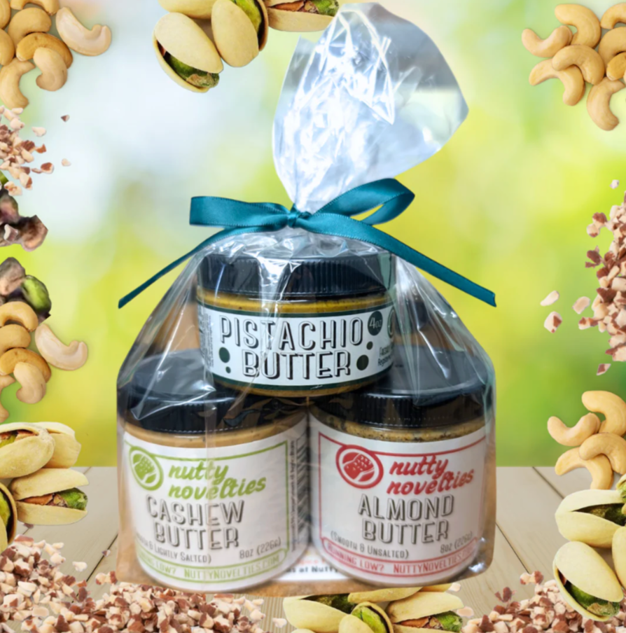 Try Nutty Novelties' Tree Nut Sampler - the ultimate taste adventure featuring a curated selection of their best selling, small batch nut butters with almonds, cashews and pistachios - Spoon - Spread - Blend Enjoy