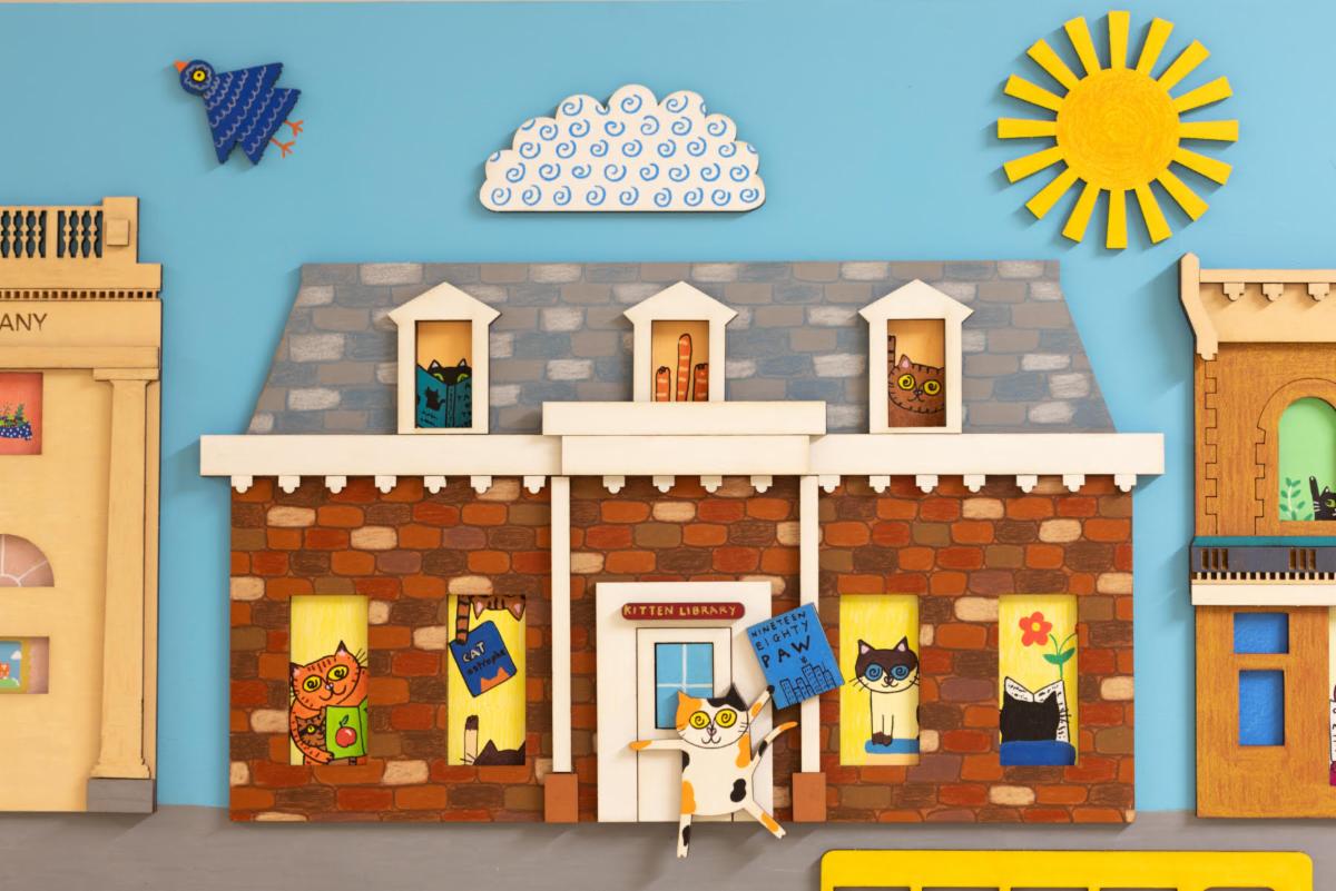Serrano shared, "When creating artwork for the "Queen Kitty City" exhibit, I wanted to celebrate New Rochelle itself. Inspired by the city’s architecture and the whimsical world of Richard Scarry’s Busy Town, I painted Street Scene, with Kitten Library - inspired BY the Huguenot Children’s Library - at its heart. I hope that my love of libraries and children’s picture books comes through in this piece, which I created using acrylic markers, colored pencil, and laser-cut shapes for added depth and playful dimension." See the full exhibit here. Photo credit: Lori Adams Photography