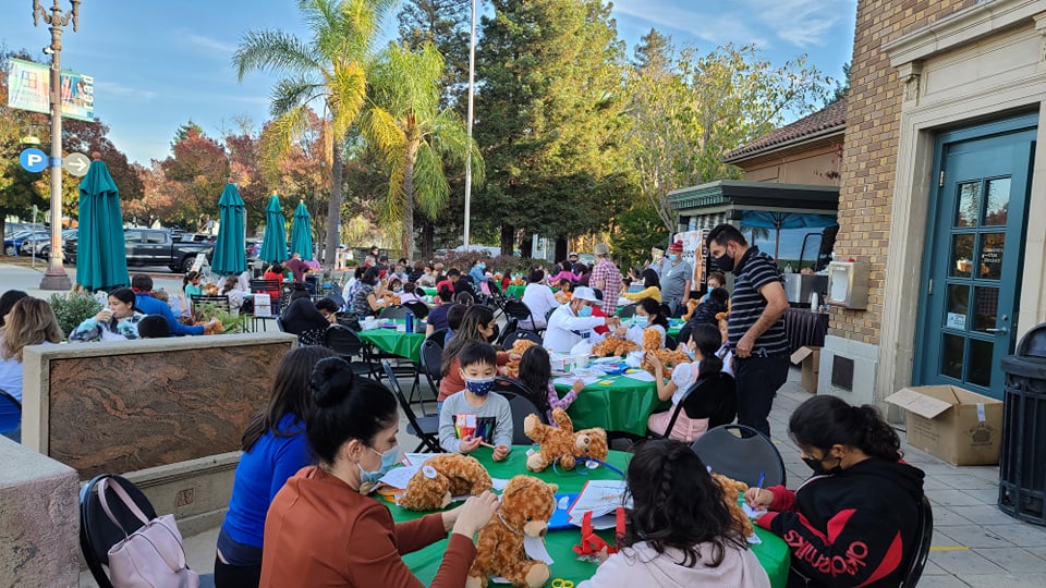 On Sunday, we kicked off the week with our Teddy Bear Tea at the Downtown Library. Over 200 kids and adults from Redwood City and North Fair Oaks joined us on the Library plaza. It was an afternoon of community fellowship and teddy bear making, and we all had so much fun! Stay tuned for the next installment of this event series, our Teddy Bear Sleepover, coming in January.