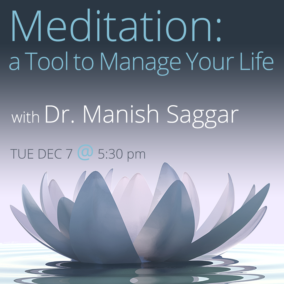 Join Manish Saggar, PhD long time meditator for this engaging program on Dec 7. The practice of meditation contributes to a more positive, healthy lifestyle.