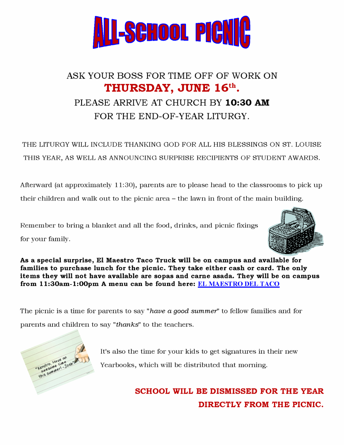 The end of the school year is almost here, with Thursday, June 16, being our final day! On this last day, we annually hold an end-of-year liturgy, followed by an all-school picnic. We are going to have a picnic this year with a special surprise of a taco truck, ready to take your orders between 11:30am-1:00pm. Please see the insert in your red envelope today for more details.