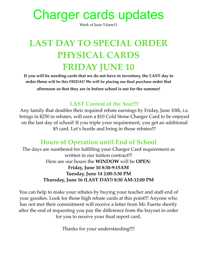 Charger Cards is considered fulfilled if you have either chosen to "opt out" and pay the $250 fee or if you bring in a minimum of $125 in rebates/profit from your yearlong Charger Card purchases. To pay the fee, please submit a check or cash (no credit cards accepted for this fee) to "St. Louise Charger Cards." If you didn't opt out and will be bringing in at least $125 in rebates/profit, please make sure you take advantage of these final weeks to purchase as many Charger Cards as needed. Please contact Tiffany and Erica in the Charger Cards office if you need help in determining how far you are away from fulfilling your commitment.