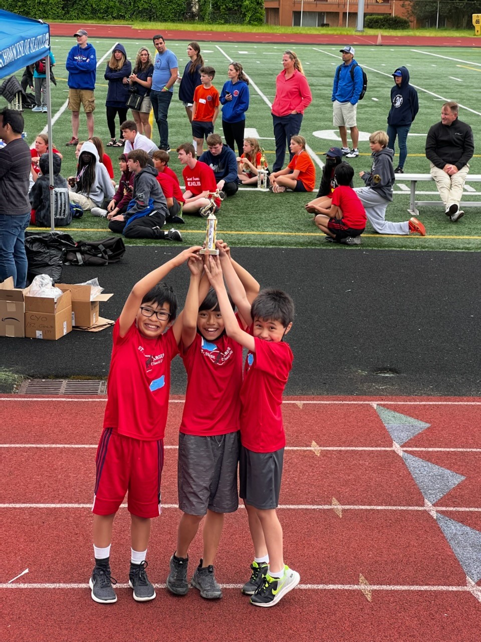 The 4th grade boys won the title, with clutch performances by Michael Miller (1600), Luis Amat Navarro (800, turbo jav, shuttle relay), Ethan Dickenson (800, turbo jav), Jethro Abueg (shuttle relay), Jolo Olayao (shuttle relay, 75, long jump), and Akean Fawcett (50, shuttle relay, softball throw). They also won 1st place in the shuttle relay.