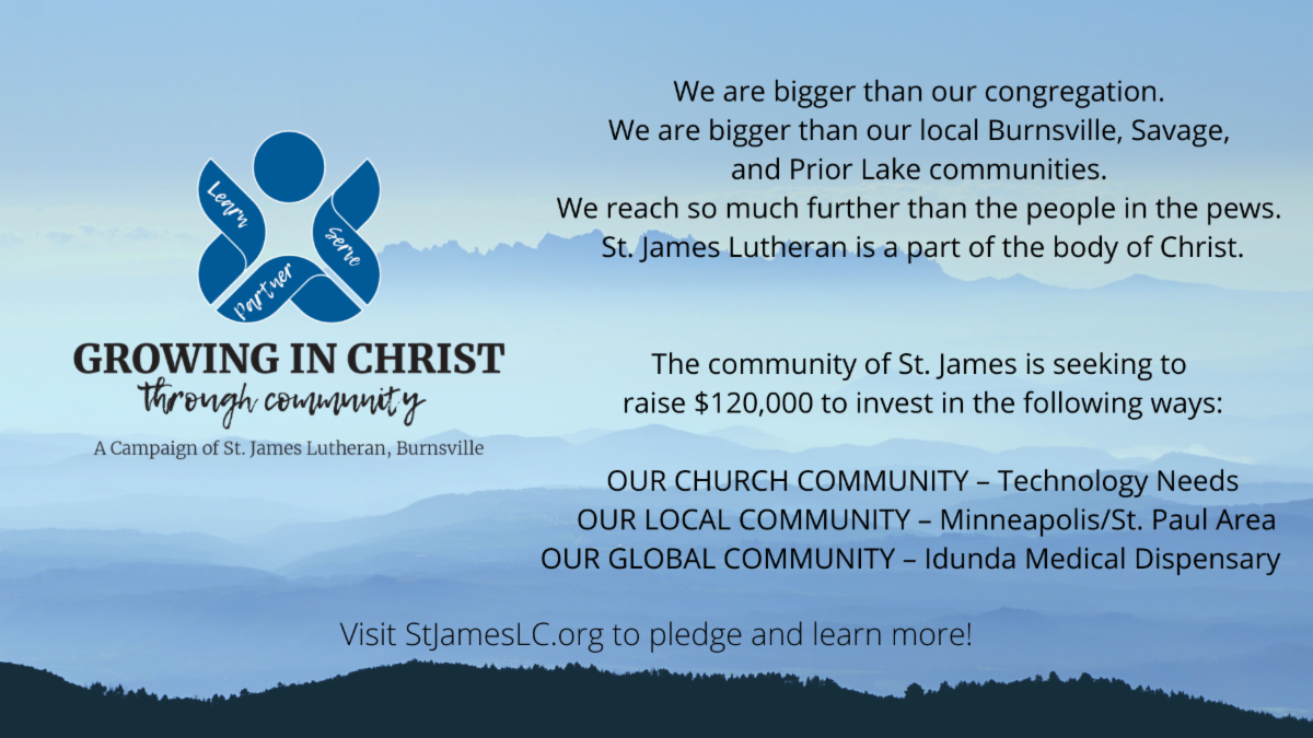St. James Lutheran Burnsville is an ELCA church whose vision is to put people before programs, commitments before consumption, and love into action in tangible ways that benefit our neighbors. We welcome people of all sexual orientations, genders, gender identities, races, ages, ethnicities, cultures, abilities, languages, religious backgrounds, and socioeconomic statuses. Our Unity is in Christ.
