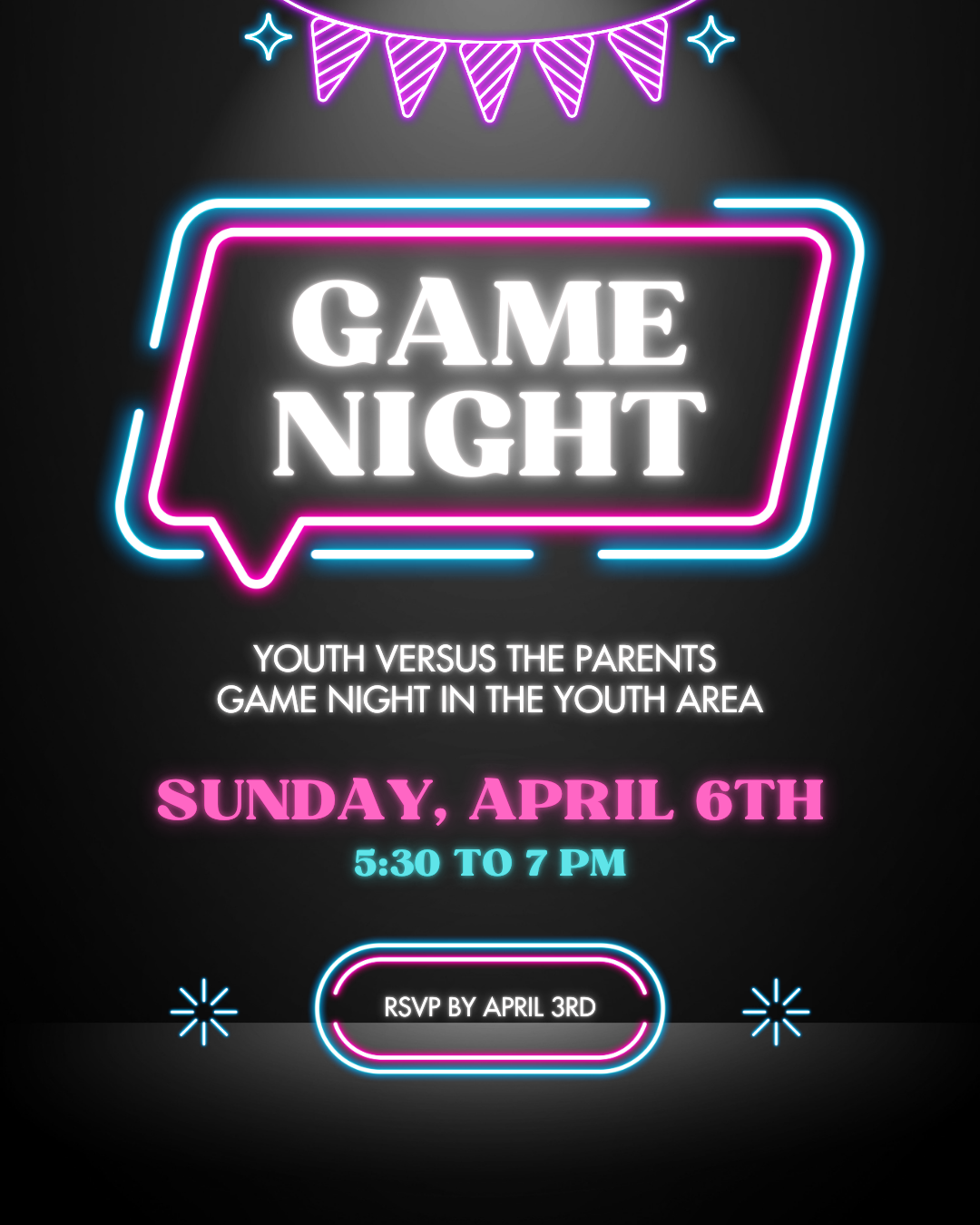 Open to all youth 7th-12th grade and their parents! Join us in the Youth Area for dinner and some friendly competition between the youth and parents with some fun games. Click link below to sign up your family by April 3rd. Contact Beth Bailey for more details and if you have any questions.