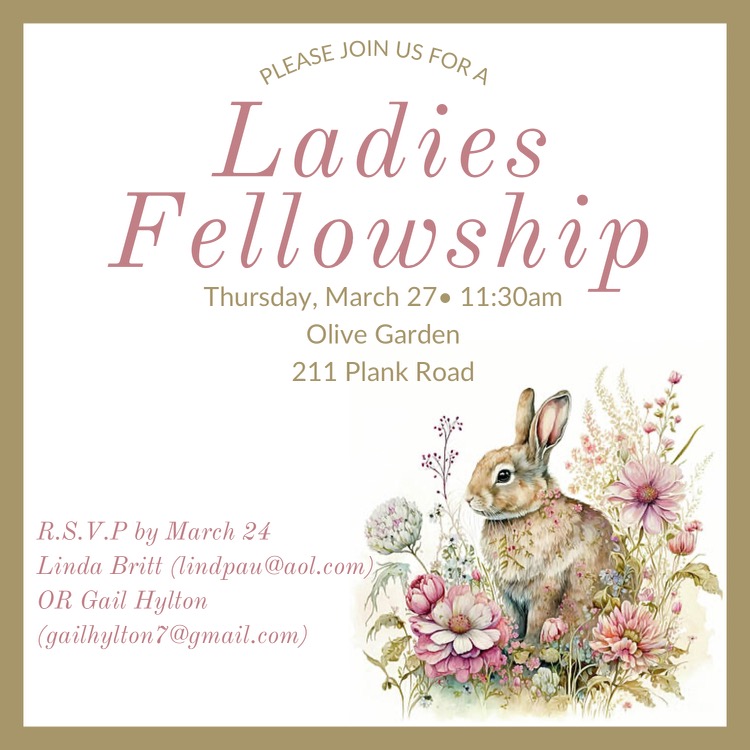 Ladies are welcome to join in a time of fellowship at the Olive Garden located at 211 Plank Road. RSVP to Linda Britt, at or Gail Hylton, by Monday, March 24. Please come and bring a friend!