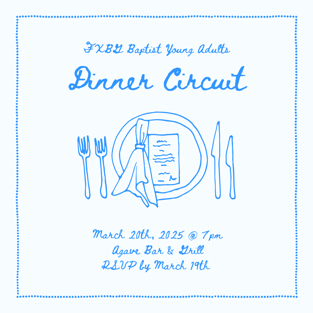 Join us for our first monthly Young Adults dinner out! We will meet at Agave Bar & Grill for dinner and fellowship. Each month, we will visit a new place in town for dinner. Use the link below to RSVP by Wednesday, March 19th. Friends & partners are welcome!