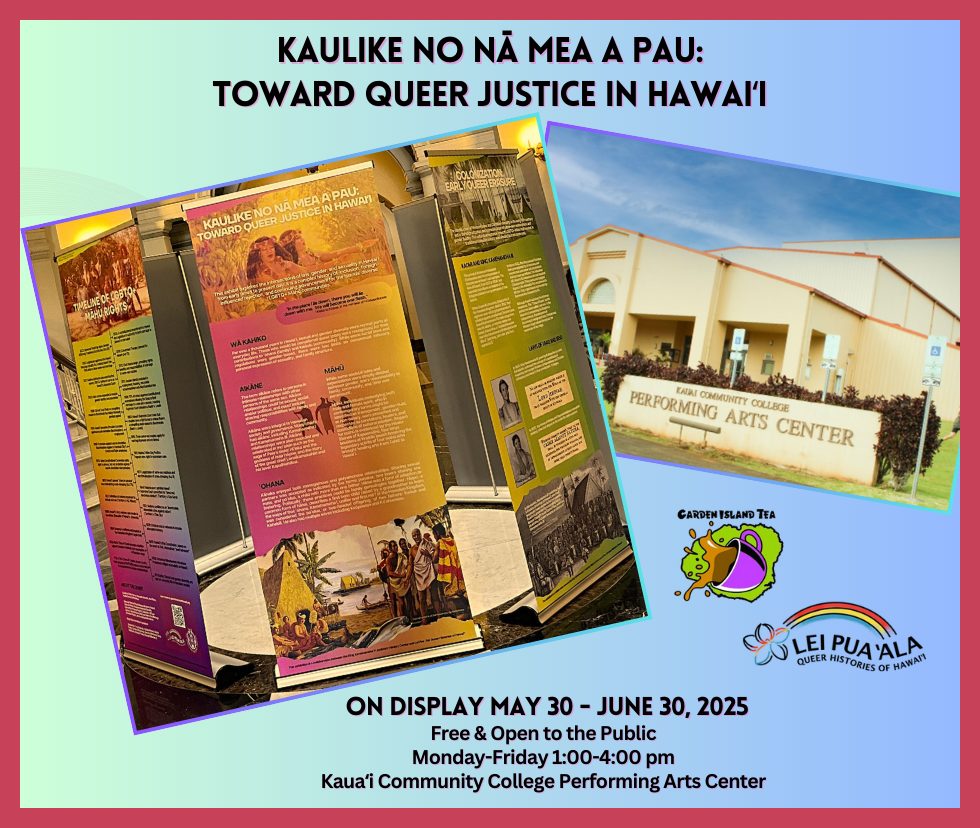Lei Pua ʻAla Queer Histories of Hawaiʻi and the Kauaʻi Community College Performing Arts Center are proud to announce the Kaua'i debut of a traveling exhibition that explores the intersections of law, gender, and sexuality in Hawaiʻi. The exhibition, free and open to the public, is on display from May 30 until June 30 in the lobby of the Kauaʻi Performing Arts Center.