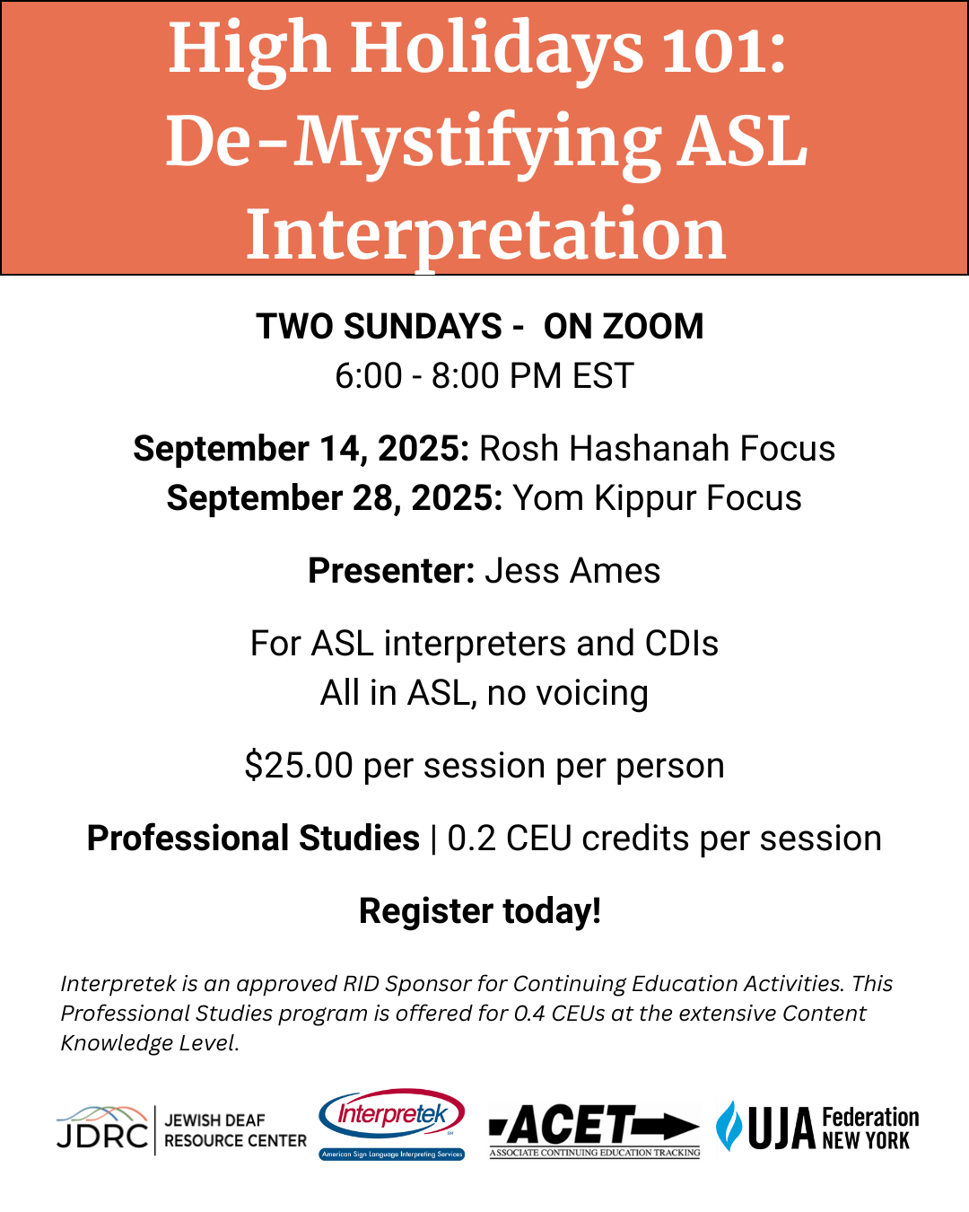 As the High Holiday approach, we're compiling a list of congregations that offer ASL interpretation and/or captioning access for in-person or virtual services which will be featured on our new website. We'll share this list widely so Deaf and Hard of Hearing individuals can find welcoming, accessible spaces to observe the High Holidays.
