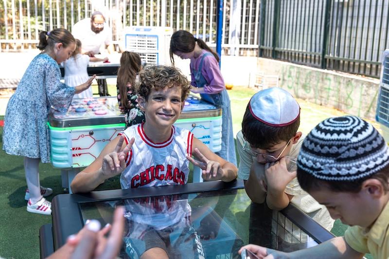 Image description: Photographed is a boy with short curly brown hair wearing a “Chicago” sports top signs “peace,” flanked by two boys in yarmulkes; girls and Rabbi Yehousha Soudakoff play in the background.