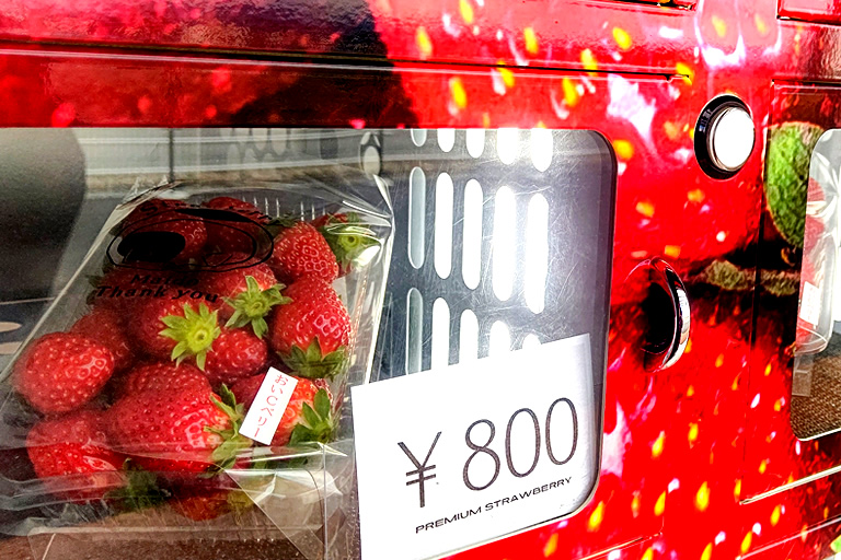 They don't just sell frozen foods, they also sell fresh foods! The strawberries in the photo are very fresh because they were picked that morning. They are very popular and sell out quickly. Such cases of vending machines selling local specialties are also common in Japan.