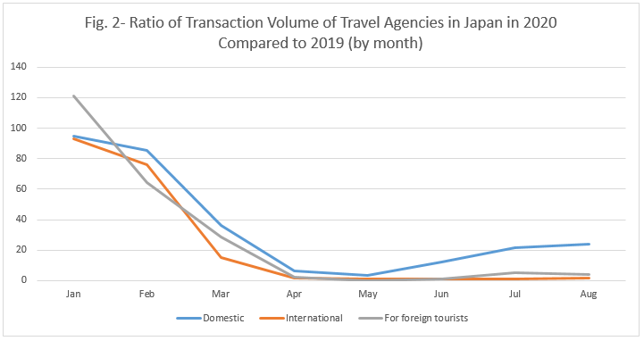 These statistics are even more striking if comparing domestic and international travel. Figure 2 shows the volume that travel agencies have seen in transactions for domestic and international travel, as well as the number from international tourists. As one may notice, international travel and guests have remained almost nonexistent, while domestic tourism has increased after having reached similar lows. With the international travel ban still in place, the rebounding of domestic tourists has surely been a welcome to a distressed tourism industry. There is hope, however, that things will make a recovery soon, as it was announced last month that foreign tourists may be allowed back into the country again on a trial basis from April 2021.23 In the meantime, the national government and tourism-related businesses will surely continue their efforts to attract those close by to participate in their “Go To Travel” campaign*, workation promotions, and staycation programs.