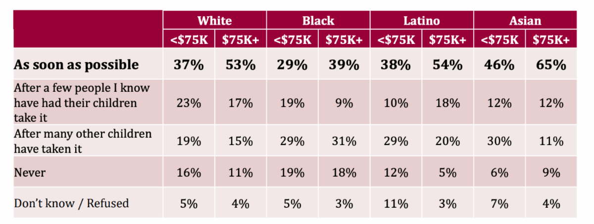 Across racial and ethnic groups and socioeconomic backgrounds, lower-income parents are less enthusiastic about getting their child vaccinated. While white, Asian and higher-income parents are more likely to seek the vaccine sooner for their child, Black, Latinx and lower-income parents are less likely to do so. This trend suggests a similar dynamic to the rollout of the adult vaccine, which has shown greatest hesitancy among Black, Latinx and lower-income residents.