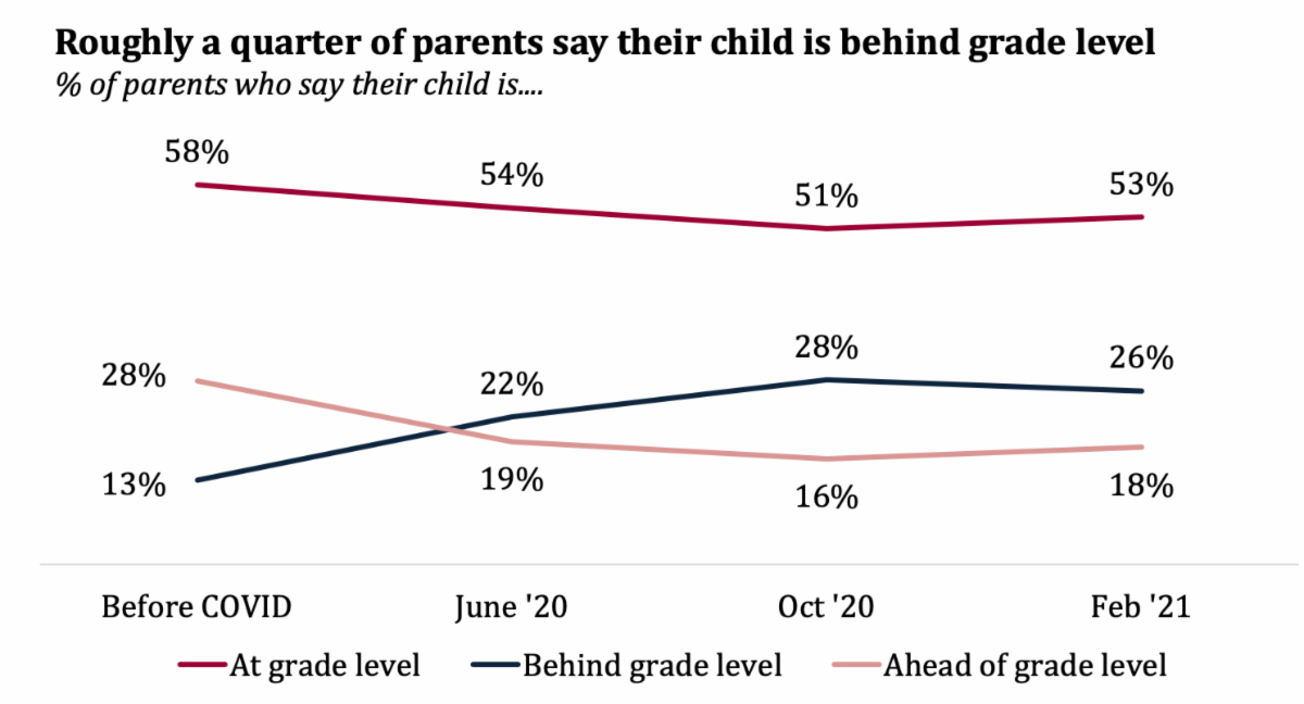 Before the pandemic, 13% of parents reported their child being behind grade level. Since the pandemic began, that number has increased to 22% by June 2020, 28% by October 2020, and plateaued at 26% in February of this year. While the reasons behind these parent perceptions are speculative, a majority of parents (57%) support summer education programs to help make up for lost learning time.
