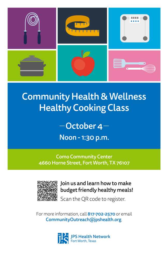 Looking for easy, delicious, and budget-friendly ways to eat healthier? Join JPS Health Network for a free, hands-on cooking class Saturday, October 4, from noon to 1:30 p.m. at the Como Community Center and learn how to prepare easy, nutritious meals that are full of flavor—on any budget. This interactive class will teach you practical cooking skills, smart ingredient swaps, and delicious recipes that support your health and well-being. Whether you're just getting started in the kitchen or looking to freshen up your meal routine, you’ll leave with the tools and confidence to cook healthy at home.