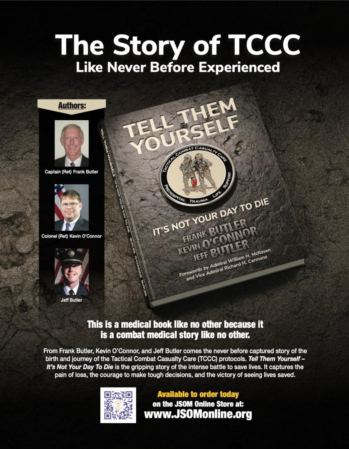 Medical history is often written by researchers, sometimes written by observers and participants, but rarely written by those who made it. Frank Butler, retired Navy Captain, SEAL, and physician, wanted to change how casualties were cared for on the battlefield. Tactical Combat Casualty Care (TCCC) is arguably the most important innovation on the battlefield since Ambrose Pare tied off bleeders and Jonathan Letterman brought medicine to the battlefield. What TCCC is and how it became not just the system of care for battlefield casualties but evolved into the care of trauma victims in the prehospital arena and to the lay community via STOP THE BLEED, is the thesis of this book...