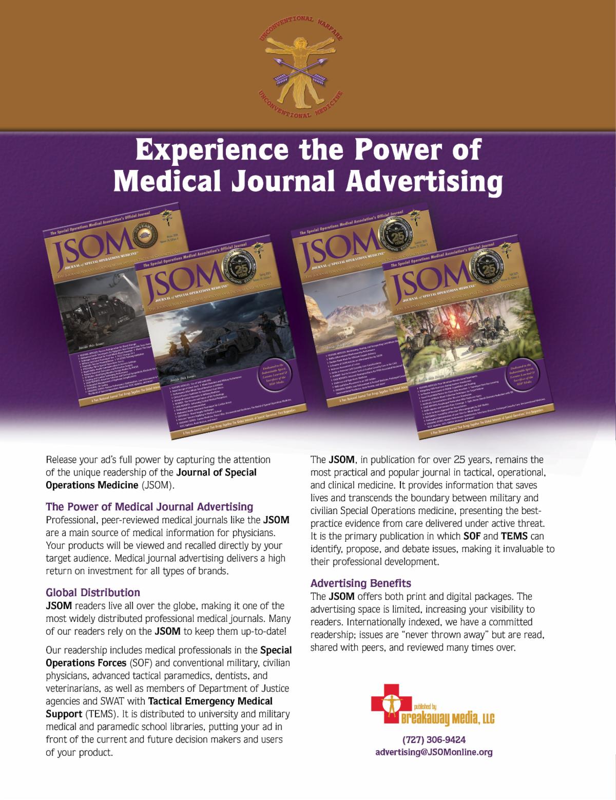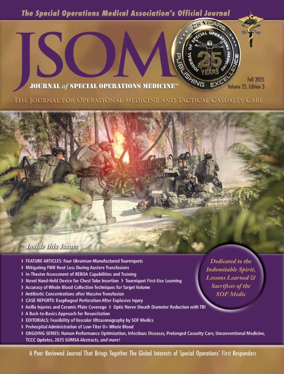 For over 20 years, the Journal of Special Operations Medicine (JSOM) has brought important, lifesaving information to the Special Operations Forces (SOF) community. And over the years, as our audience and readership has expanded into over 80 countries, physicians, military and tactical medics, and other medical professionals working in unconventional environments rely on the JSOM for breakthrough research at the intersection of operational medicine and tactical casualty care. Our peer-reviewed research and interactive clinical content make the JSOM a must-read for: