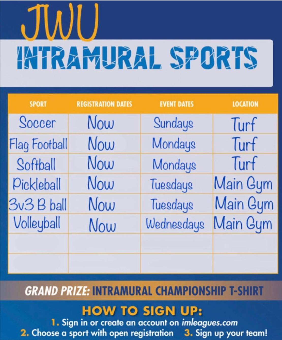 Registration for fall intramurals is now open. Students can choose from offerings in Soccer, Flag Football, Softball, Pickleball, 3-on-3 Basketball and Volleyball. Intramurals provide a great opportunity for camaraderie and fun. Students can sign up individually or as part of a team.