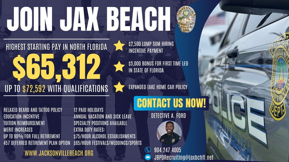 Jacksonville Beach Police Department is hiring! Contact our recruiter, Detective Ford, for more information. You can also find more information on our webpage by clicking Join JBPD.